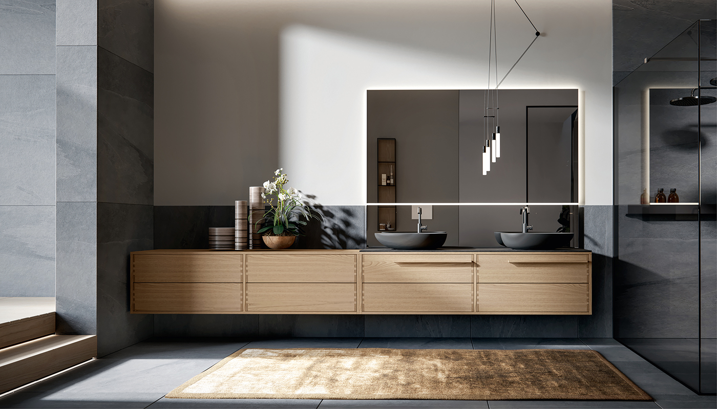 Le spinature dritte in massello, visibili a contrasto sui frontali e nelle parti laterali dei cassetti, diventano motivo tecnico ed ornamentale.